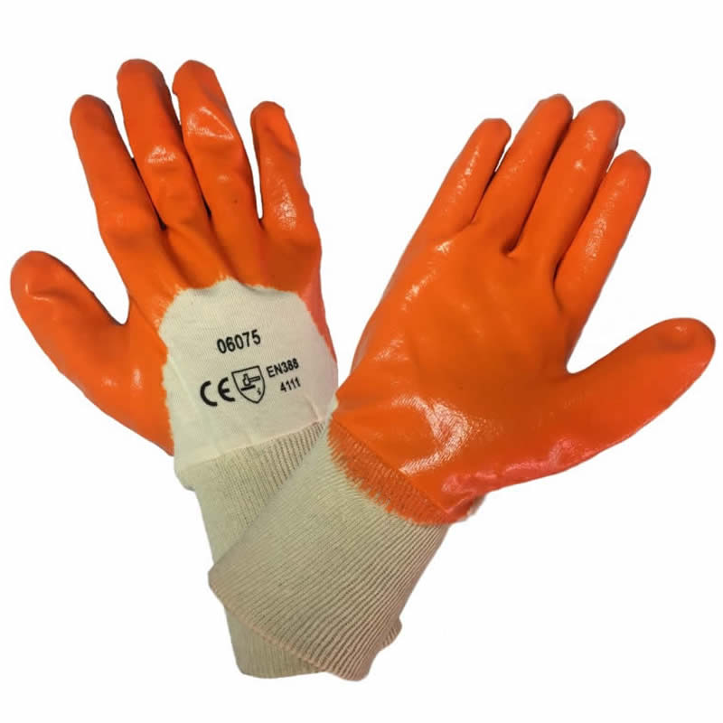 Guantes de seguridad confeccionado en tejido de algodón con revestimiento en nitrilo en la palma, dedos y puño de malla de algodón. Modelo con ventana en el dorso.