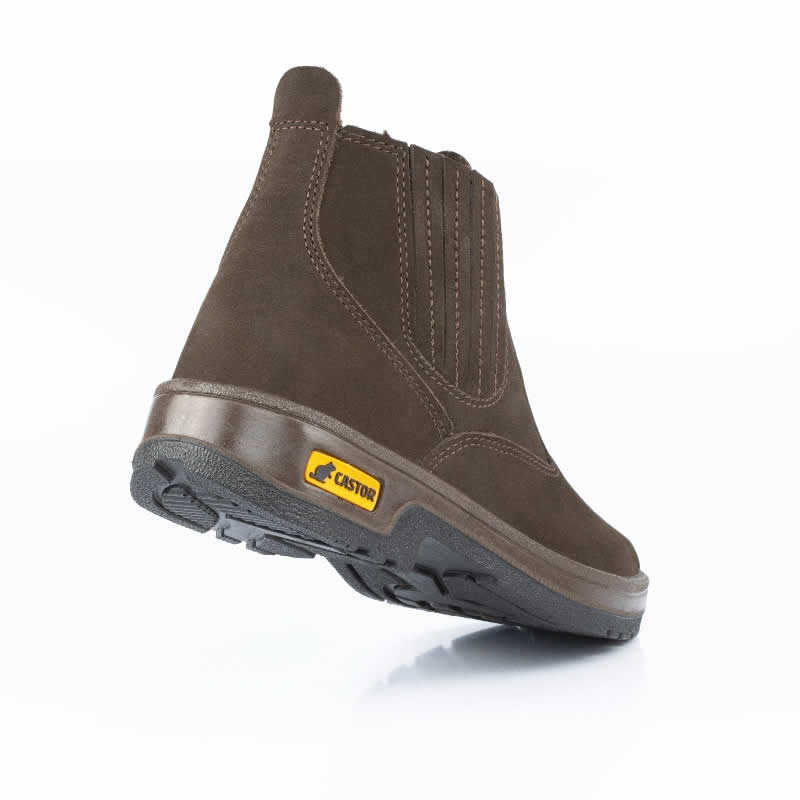 Bota con elástico en nobuck Plantilla en PU cosida con sistema strobell Suela en poliuretano de doble densidad inyectada directamente en el corte.