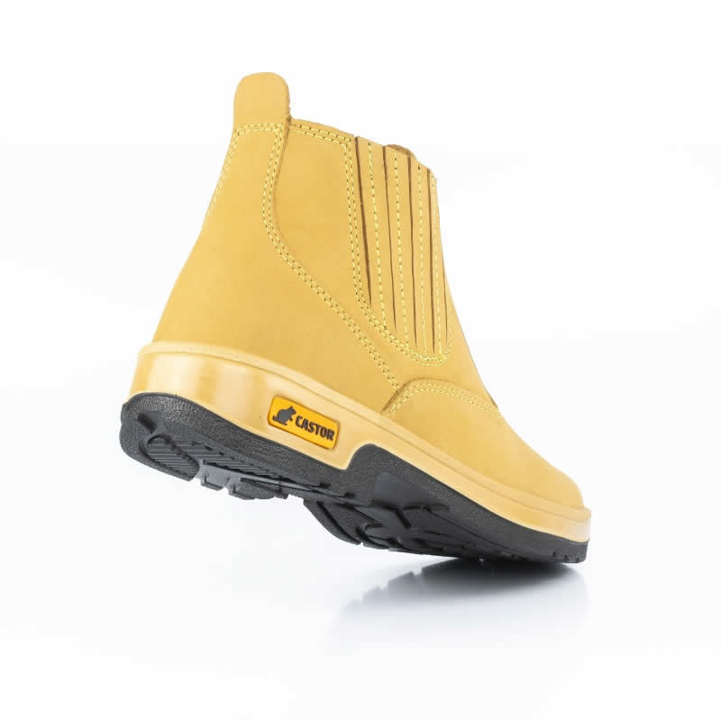 Bota con elástico en nobuck. Plantilla en PU cosida con sistema strobell. Suela en poliuretano de doble densidad inyectada directamente en el corte